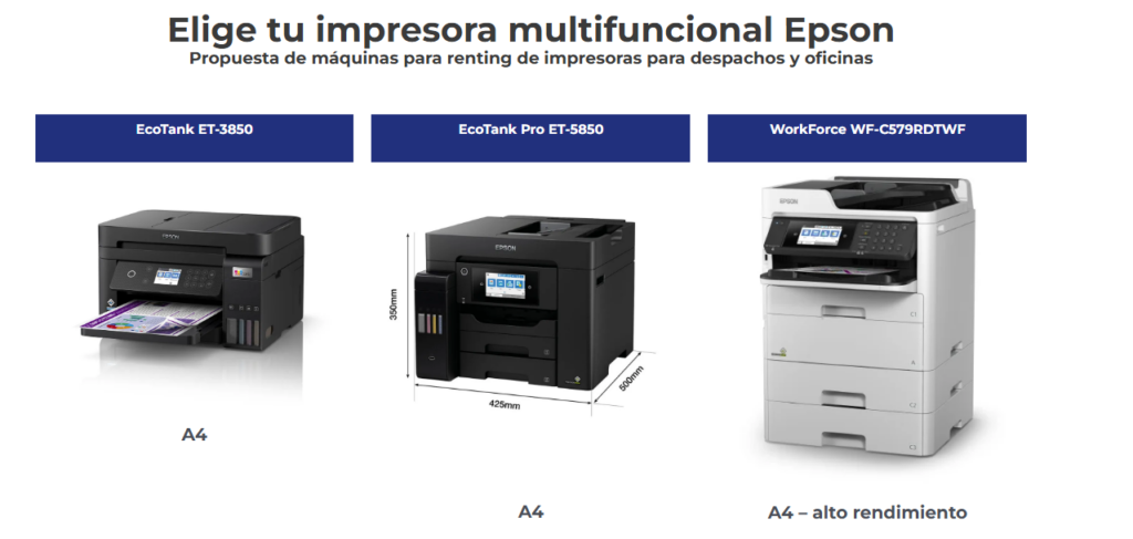 Optimiza tu negocio con el renting de impresoras multifuncionales de EPSON. Ofrecemos asesoramiento personalizado para ayudarte a elegir la mejor solución para tu despacho u oficina, garantizando la eficiencia y calidad en tus impresiones.